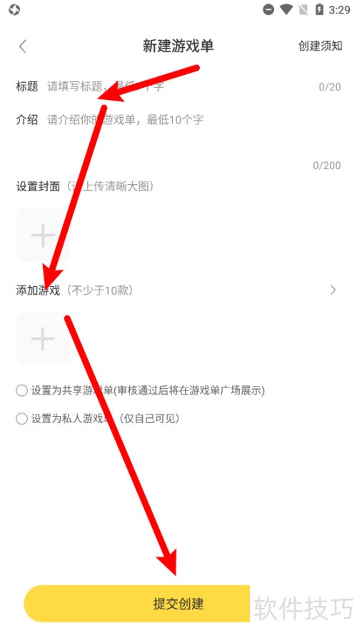 3、 填写游戏名称并添加游戏内容,最后点击提交创建按钮完成操作。