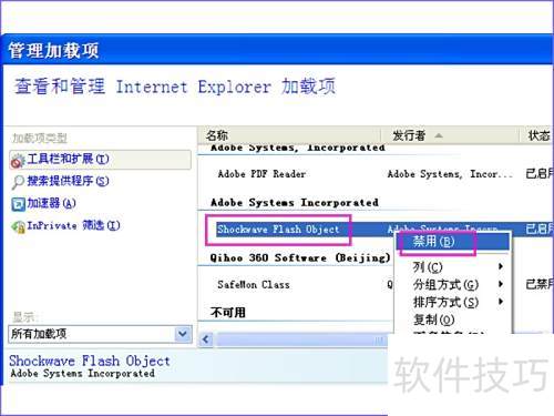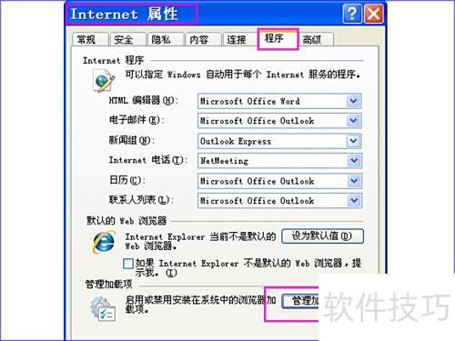 5、 本着探究问题根源的态度,继续深入排查。点击开始菜单,选择运行,输入inetcpl.cpl后确认。进入IE的Internet属性窗口,切换到程序选项卡,点击管理加载项。在列表中找到Shockwave Flash Object,右键选择禁用。随后关闭所有IE窗口,重新启动浏览器,访问原先会出现闪烁的网站。虽然部分图片和动画无法显示,但页面闪烁的问题已不再出现,运行趋于稳定。