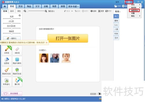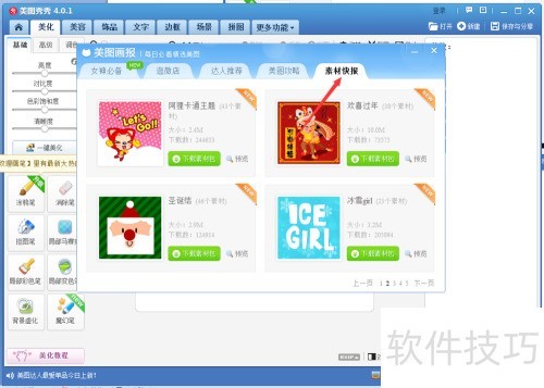 5、 安装完毕后,打开美图软件,点击右上角下拉菜单,选择美图画报,开始安装所需素材包。