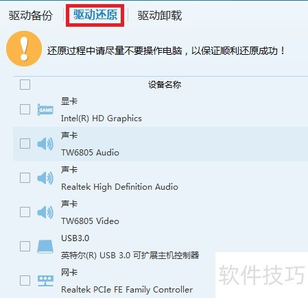 5、 进入驱动管理界面,选择下方的驱动还原选项进行操作。