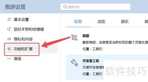 4、 进入设置,查找功能与扩展选项。
