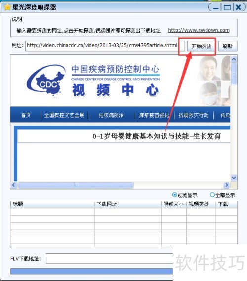 2、 打开深度嗅探器主界面,复制网页视频播放链接,粘贴至工具地址栏,点击开始探测即可启动分析。