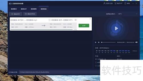 3、 文件添加完毕后,需设置音频转换格式。在界面右上角点击选择输出格式,弹出下拉菜单,其中包含多种格式选项,选择MP3即可。选定格式后,还需进一步设置音质、声道模式及编码参数,确保输出效果符合需求。