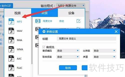 3、 接下来操作较为简单,点击输出格式右侧的下拉箭头,从列表中选择所需的MP3格式。若需调整参数,可点击编辑按钮进行设置,完成后点击确认即可完成配置。