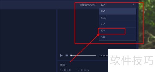 3、 接下来需设定音频转换后的输出格式,可在界面右上方选择输出格式区域进行操作。由于目标是将FLAC音频转为MP3,因此应将输出格式选择为MP3,确保转换后的文件符合所需格式要求,便于后续使用与播放。
