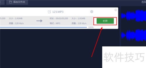 6、 音频格式转换完成后,点击界面上的打开按钮,便可直接查看已转换为MP3格式的音频文件,操作便捷。此外,也可进入之前设定的保存目录,手动查找并播放转换完成的音频。
