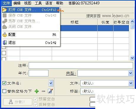 1、 安装并启动WAV整轨分割工具,进入操作界面后,点击文件菜单,选择打开CUE文件即可。