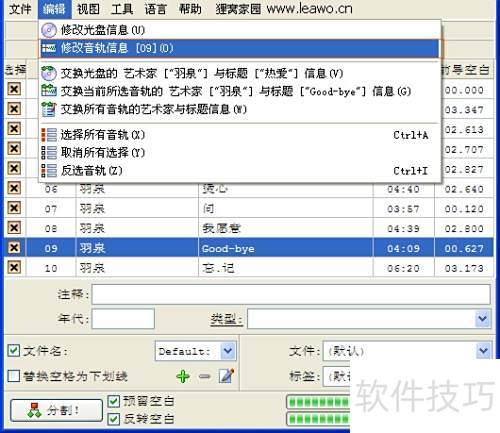 2、 在软件界面的列表区域,可查看音乐专辑中的各个音轨,例如羽泉热爱专辑包含的十首歌曲。选择其中一首,通过编辑菜单中的修改音轨信息功能进行调整。