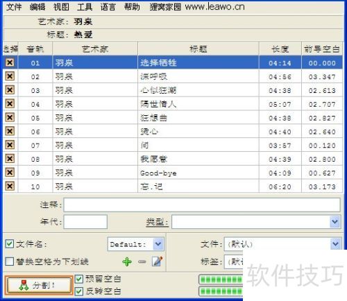 3、 在列表区域中选择需分离的单曲,默认已全选。勾选预留空白与反转空白选项,最后点击分割按钮,即可完成分轨操作。