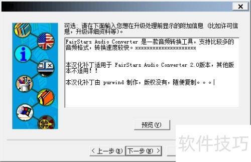4、 请在此处填写补丁或软件的简要说明、授权信息等内容,可自由选择正式或轻松的语气。完成后点击预览查看效果,确认无误后点击下一步继续操作。