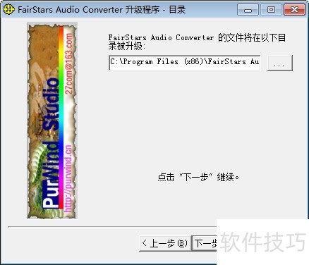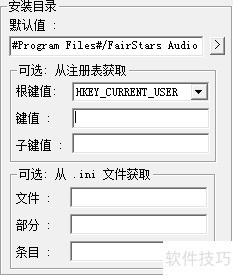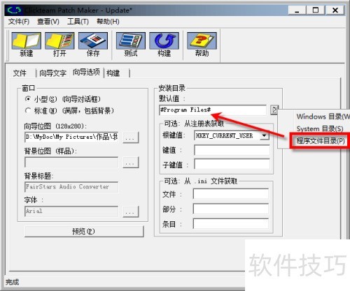 10、 在向导选项选项卡中,此前第⑦步尚未设定安装位置。此时应点击安装目录下的默认值选项。由于大多数程序默认安装路径为系统盘的Program Files文件夹,因此选择程序文件目录即可。此时地址栏会自动填充Program Files路径,随后在该路径后方手动添加FairStars Audio Converter文件夹名称,完成自定义安装路径的设置,确保程序安装到指定目录中。