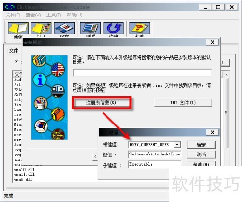 7、 此处用于设定查找待汉化软件安装路径的方式。通常可通过注册表获取,例如3ds Max,在注册表中存在对应键值记录安装目录,可依此填写,所示。设置后点击预览,系统将自动填入路径。本例中目标软件无相关注册表项,故暂时留空,后续再行配置。确认后点击下一步继续操作。