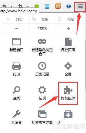 2、 启动火狐浏览器,点击右上角菜单,从选项中选择附加组件即可进入相关设置界面。