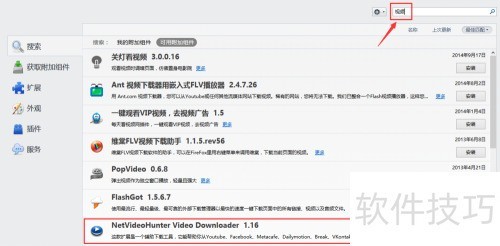 3、 在页面右上角的搜索框内输入视频进行搜索,找到netvideohunter 1.16后下载并完成安装。