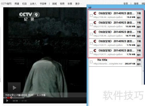 5、 在网上搜索所需视频,例如央视纪录片,找到目标内容后点击播放。接着点击浏览器插件工具栏中的按钮,会弹出下载窗口,选择所需视频文件,将所有相关片段逐一下载保存即可完成操作。