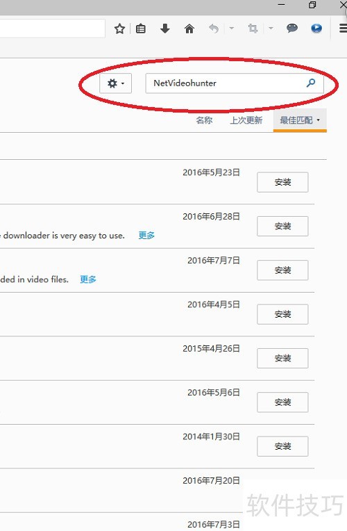 3、 打开页面后,在右侧搜索框输入NetVideohunter和网络视频捕捉,安装完成后需重新启动浏览器。
