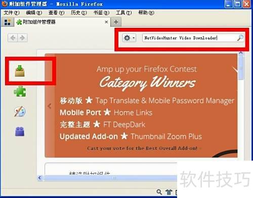 3、 打开附加组件管理器,点击获取附加组件,在页面右上角的搜索栏中输入NetVideoHunter Video Downloader进行查找并安装。