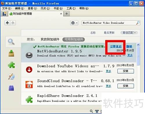 5、 安装组件后需重启Firefox,以确保其完全生效并启用。