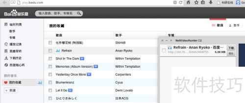7、 打开百度音乐盒,播放任意歌曲后启动netvideohunter,即可看到所示界面,轻松实现音乐直接下载,操作简单便捷,快速获取喜欢的音频内容。