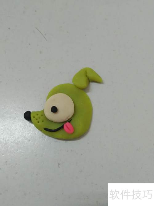 3、 取一块黄绿色面团搓成条状,压扁后对折,尾部捏细,固定于小狗头部作为耳朵。