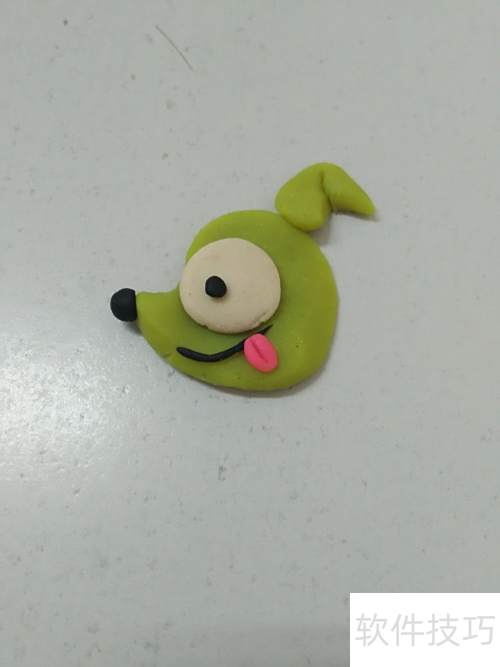 8、 将粉色泥团捏成椭圆状,贴于嘴右侧,用指甲自上而下压出竖纹,形似舌头。