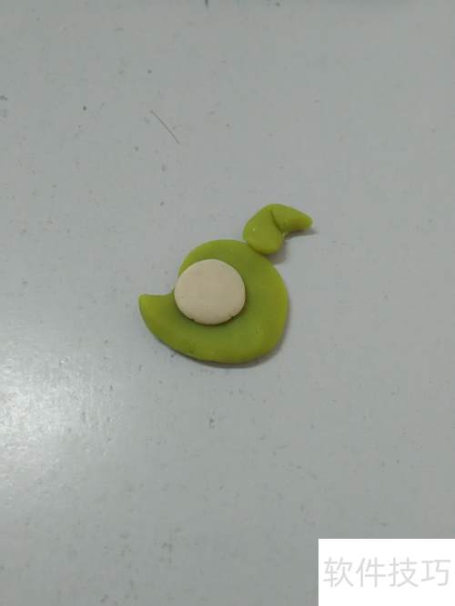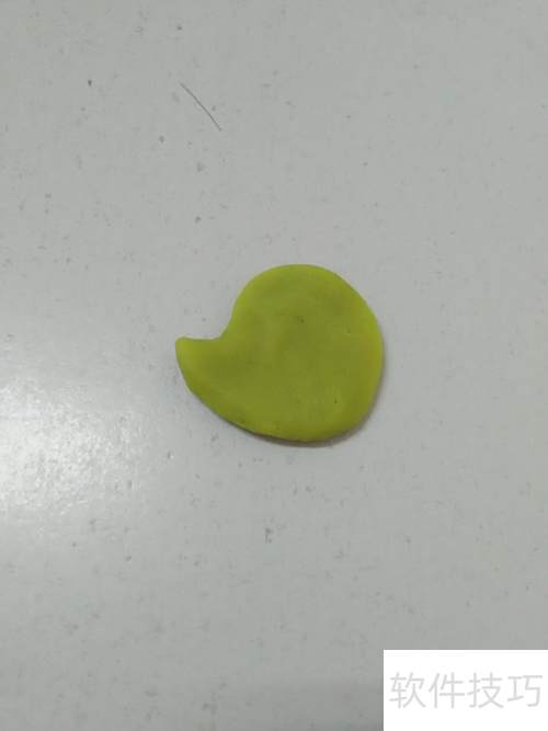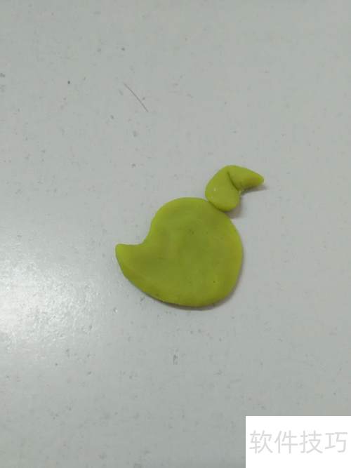 2、 用黄绿色泥团捏出左端尖突的圆状,作小狗头部,尖端为嘴部。