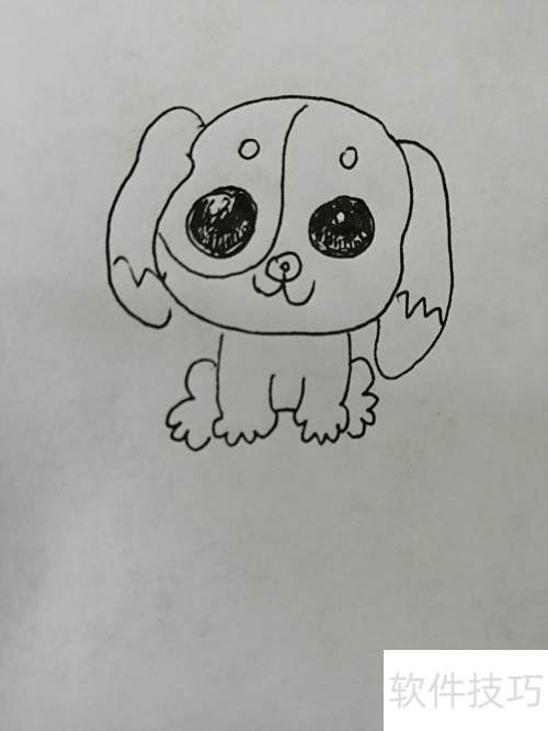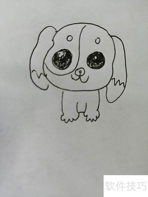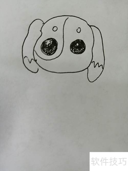 5、 第五步,继续描绘出小狗那双圆润可爱的大眼睛。