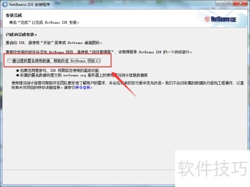 11、 安装完成后,取消勾选发送匿名使用数据以帮助改进NetBeans项目,然后点击完成按钮。