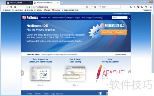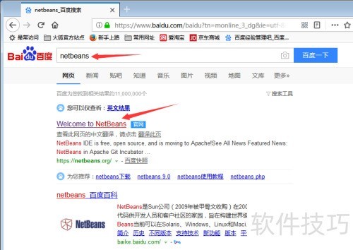 1、 在浏览器中输入百度,搜索netbeans,结果页面首个链接便是NetBeans项目主页。点击显示为Welcome to NetBeans的链接,即可跳转至NetBeans官方网站首页,进入后可查看相关开发工具介绍与资源下载等内容。