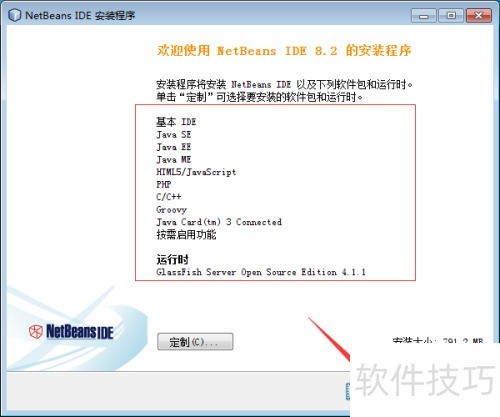 4、 在NetBeans欢迎界面中,可查看当前版本默认安装的组件,也可点击定制按钮选择所需组件类型。完成配置后,点击下一步按钮,进入后续安装步骤。界面简洁明了,操作流程清晰,便于用户根据需求灵活设置开发环境,提升使用体验。