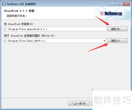7、 在选择GlassFish安装目录及JDK目录界面,可通过浏览按钮分别指定对应路径。完成设置后,点击下一步按钮,进入后续配置步骤。
