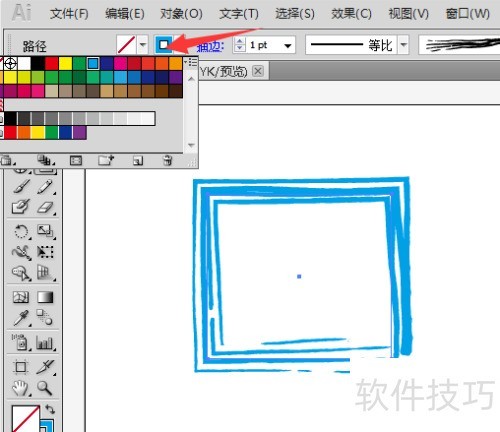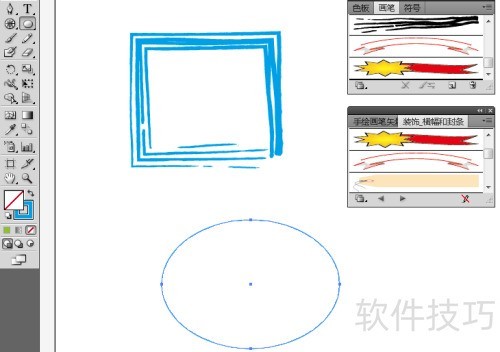 3、 用矩形工具画出矩形,保持选中状态,切换到画笔工具,从画笔库中选取所需笔刷并点击,矩形的边框便会自动应用所选笔刷样式。