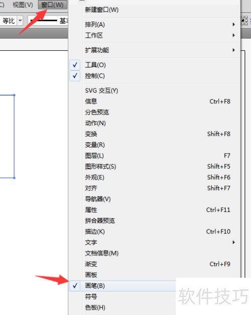 2、 在窗口中定位画笔工具,打开面板后点击右侧三角形展开菜单,选择画笔库。库内包含多种笔刷类型,可任选一两种进行尝试。