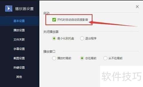 3、 在基本设置中找到启动选项,勾选开机时自动启动百度影音即可完成设置。