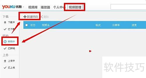 3、 进入菜单后选择视频管理,点击转码中,再新建转码任务。