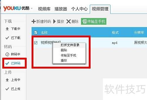 7、 点击已转码,找到视频后右键,按图示操作并打开文件夹目录。