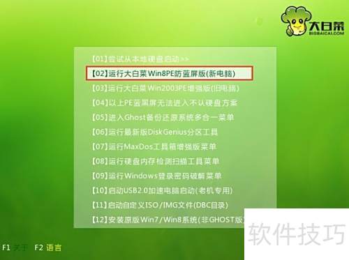 1、 将大白菜U盘插入USB接口,台式机用户建议连接机箱后置接口。重启电脑,在开机画面出现时,通过启动快捷键进入U盘启动,进入大白菜主菜单。选择运行大白菜Win8PE优化版(新电脑)并按回车确认,即可进入系统安装准备界面,开始后续操作。
