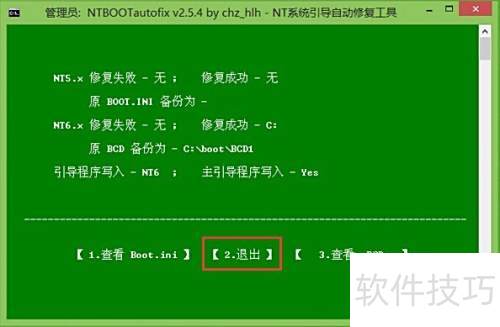 4、 修复完成后,输入2退出修复工具,或输入1查看Boot.ini文件内容。