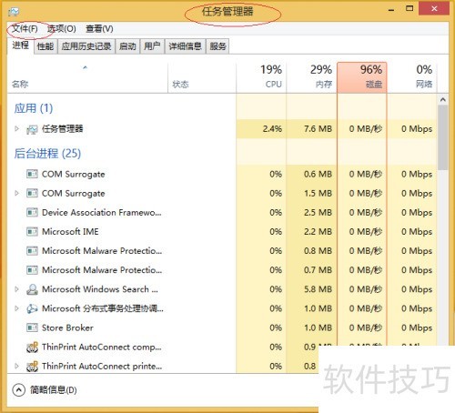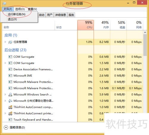 3、 打开任务管理器,选择文件菜单中的相应选项。