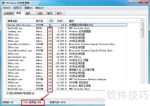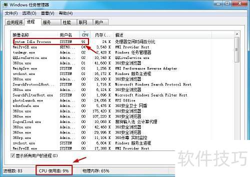 2、 打开任务管理器后,若发现System Idle Process进程的CPU占用率异常偏高,许多人会感到紧张,担心系统出了问题。实际上,这种情况属于正常现象,无需过度担忧,接下来的内容将为你详细解释其中原因。