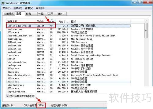 4、 除了系统空闲进程外,所有进程的CPU占用率相加即为总的CPU使用率。任务管理器底部显示的实时百分比数据,才真正反映了CPU当前的实际负载情况,这才是用户最应关注的核心指标。