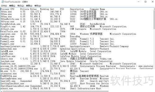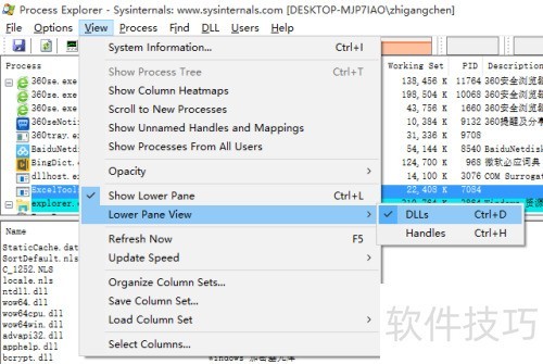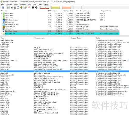 4、 选择目标程序,将鼠标移至Process Explorer窗口底部,按下Ctrl+A全选,随后导出为TXT格式的详细信息文件,操作示意图如下所示。