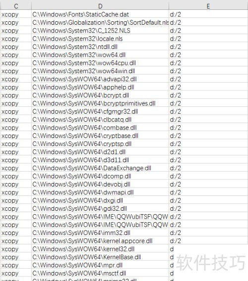6、 新建一个Excel文件,将内容复制进去,删除前面几列,仅保留路径列。在该列前插入xcopy,后一列填入目标路径,具体格式如示例所示。