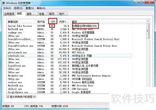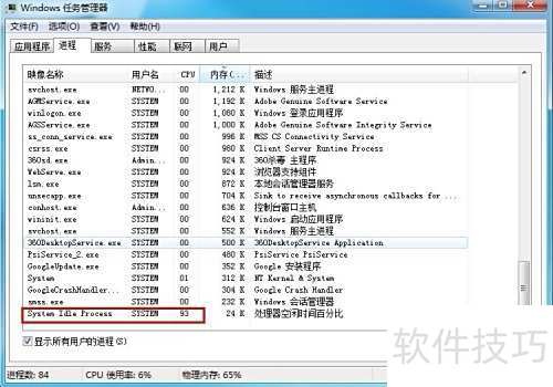 3、 将CPU进程按占用率从高到低排列后,System Idle Process通常会排在首位。许多人容易忽略进程后面的说明信息,实际上这些描述很有意义。该进程后的文字显示的是处理器空闲时间的百分比,通俗来讲,就是反映CPU当前未被使用的剩余空闲容量,数值越高说明CPU越空闲。