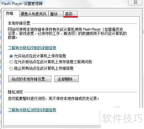 4、 此时将弹出Flash Player设置窗口,无需更改其他选项,直接点击进入高级标签页即可。