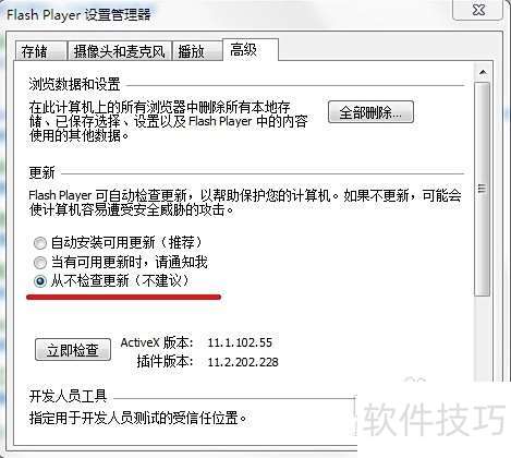 5、 将更新设置为从不检查更新,可防止自动更新拖慢开机速度。但此举会导致无法及时获取Adobe Flash Player的更新,可能带来安全风险,因此建议用户定期手动检查并安装最新版本,以兼顾系统运行效率与安全性。