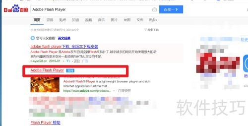 2、 打开浏览器,在地址栏输入Adobe Flash Player,按下回车键或点击搜索按钮进行搜索,操作所示。