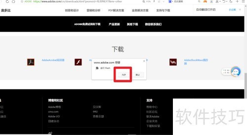 5、 第五步未跳转至下载页面,请滚动至页面最底端,找到Adobe Flash Player并点击允许,操作所示。