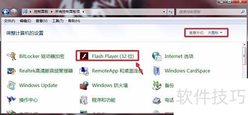 1、 进入电脑控制面板,将查看方式设为大图标,找到并点击Adobe Flash Player插件,按照图示步骤进入操作界面,本文以Windows 7系统为例进行演示说明。