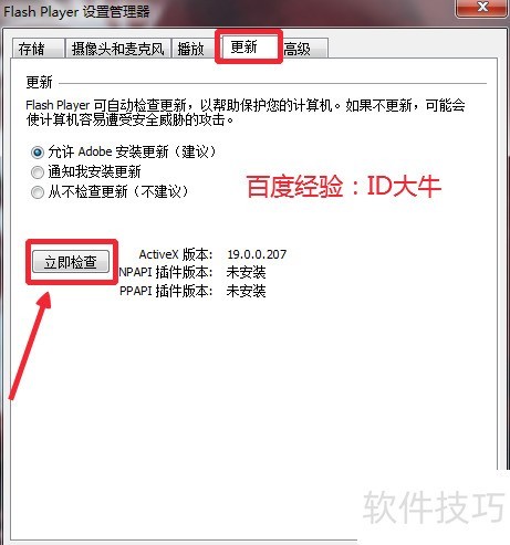 2、 在Adobe Flash Player设置管理器界面中,点击立即检查按钮进行更新。也可选择允许Adobe自动安装更新,以便系统日后自动完成升级,无需手动操作,确保软件始终保持最新状态。